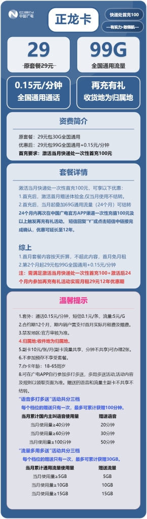 广电正龙卡属于“固定低月租+通用流量”为核心的套餐形态,月租29元,流量以全国通用为主,适用于以日常上网为主要需求的使用场景。