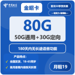 2基础信息 套餐名称:电信金昭卡 运营商:中国电信 月租资费:优惠后19元/月(原月租39元/月;月租存在阶段性变化,详见“优惠详情”) 包含流量:80G(50G全国通用+30G全国定向) 语音通话:0.1元/分钟(入网前180天关闭长途语音能力,详见注意事项) 短信资费:0.1元/条 套外流量:5元/GB 首充要求:激活当月通过专属链接一次性首充50元(以详...