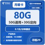 2基础信息 套餐名称:电信月曜卡(编号:71685) 运营商:中国电信 月租资费:优惠期29元/月(原月租39元/月) 包含流量:80G(50G全国通用+30G全国定向) 通话资费:0.1元/分钟(全国通用通话计费) 短信资费:0.1元/条 套外流量:5元/GB 优惠条件:激活当月需首充100元后方可享受优惠(首充要求以激活当月完成为准) 首充优惠说明:参与“...